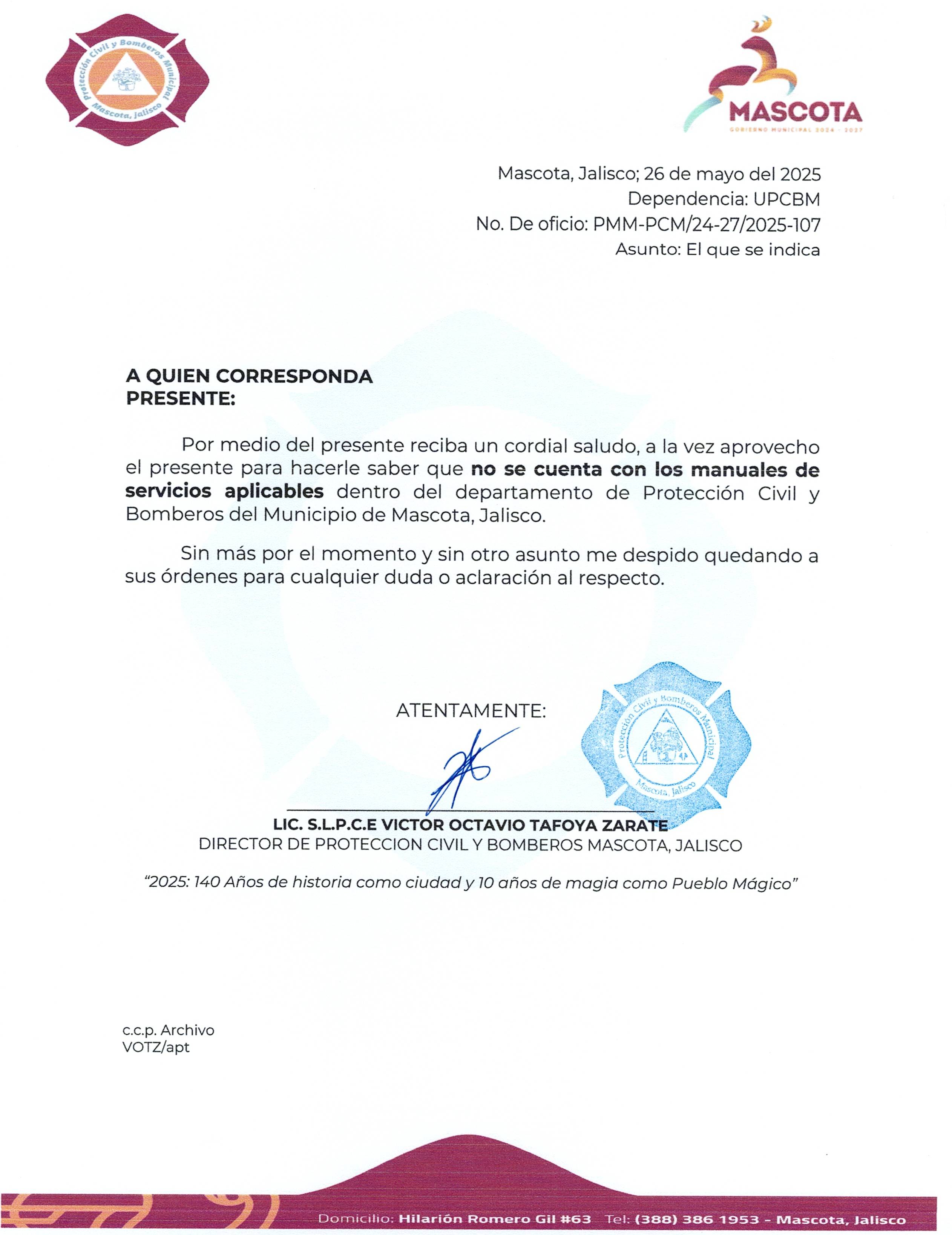 El presente es una justificación ya que actualmente no se cuenta con dicha documentación en el departamento de Protección Civil y Bomberos Mascota. |